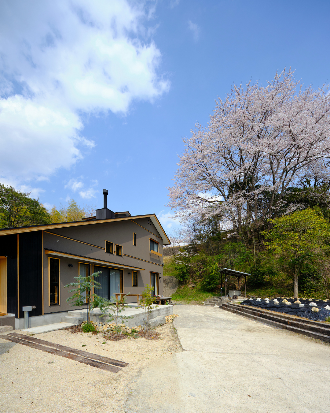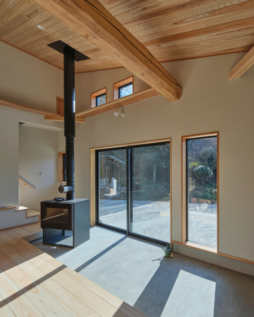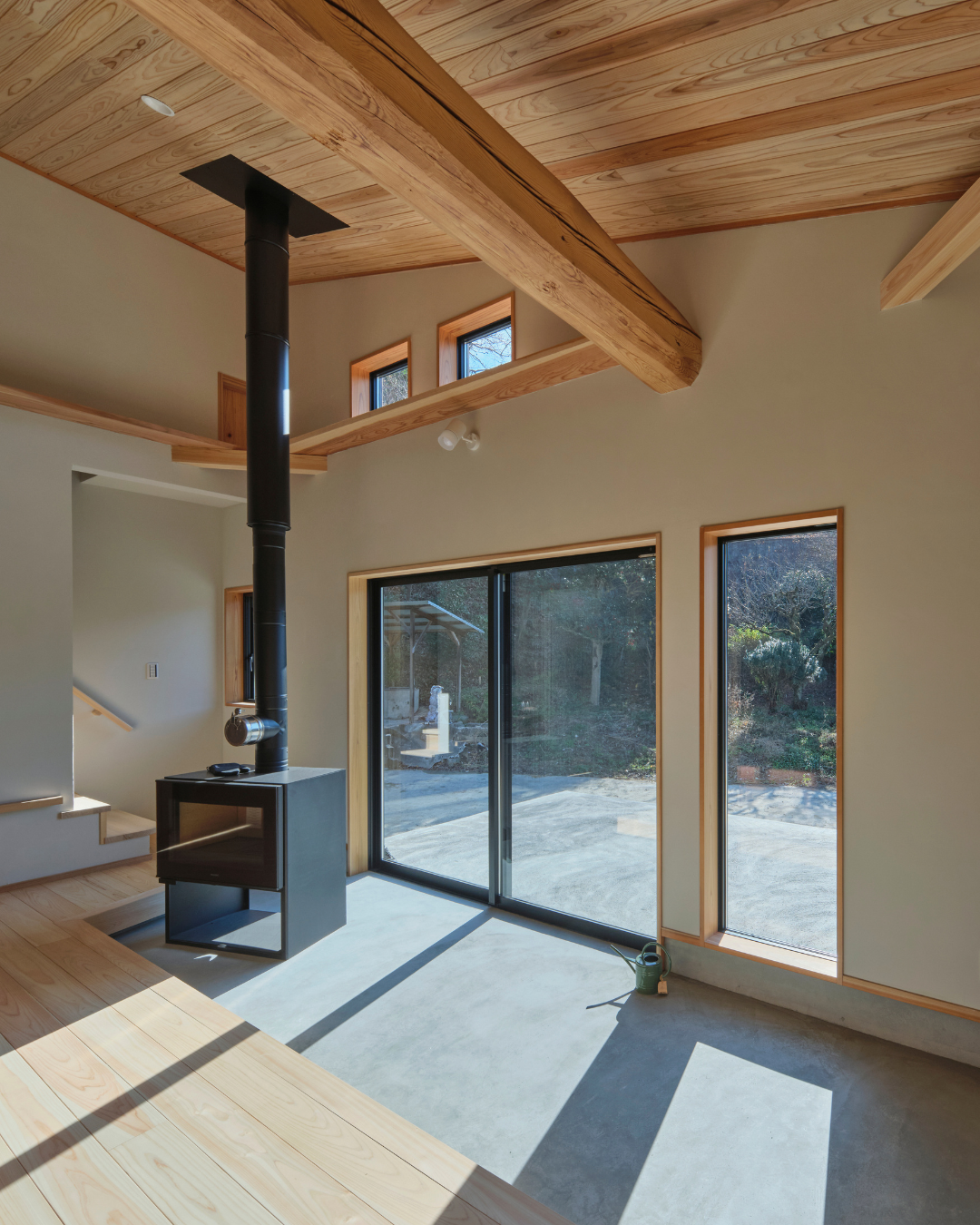 古民家の梁を生かしたリビングや、キャットウォークや土間に設けた薪ストーブなど、