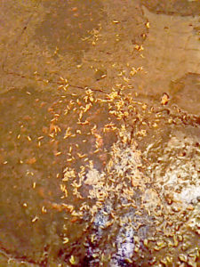 長年の使用で、脱衣場の床が少しぶかぶかするということで、洗濯機を移動して洗濯パンを取ってみると、アッ!シロアリの巣!