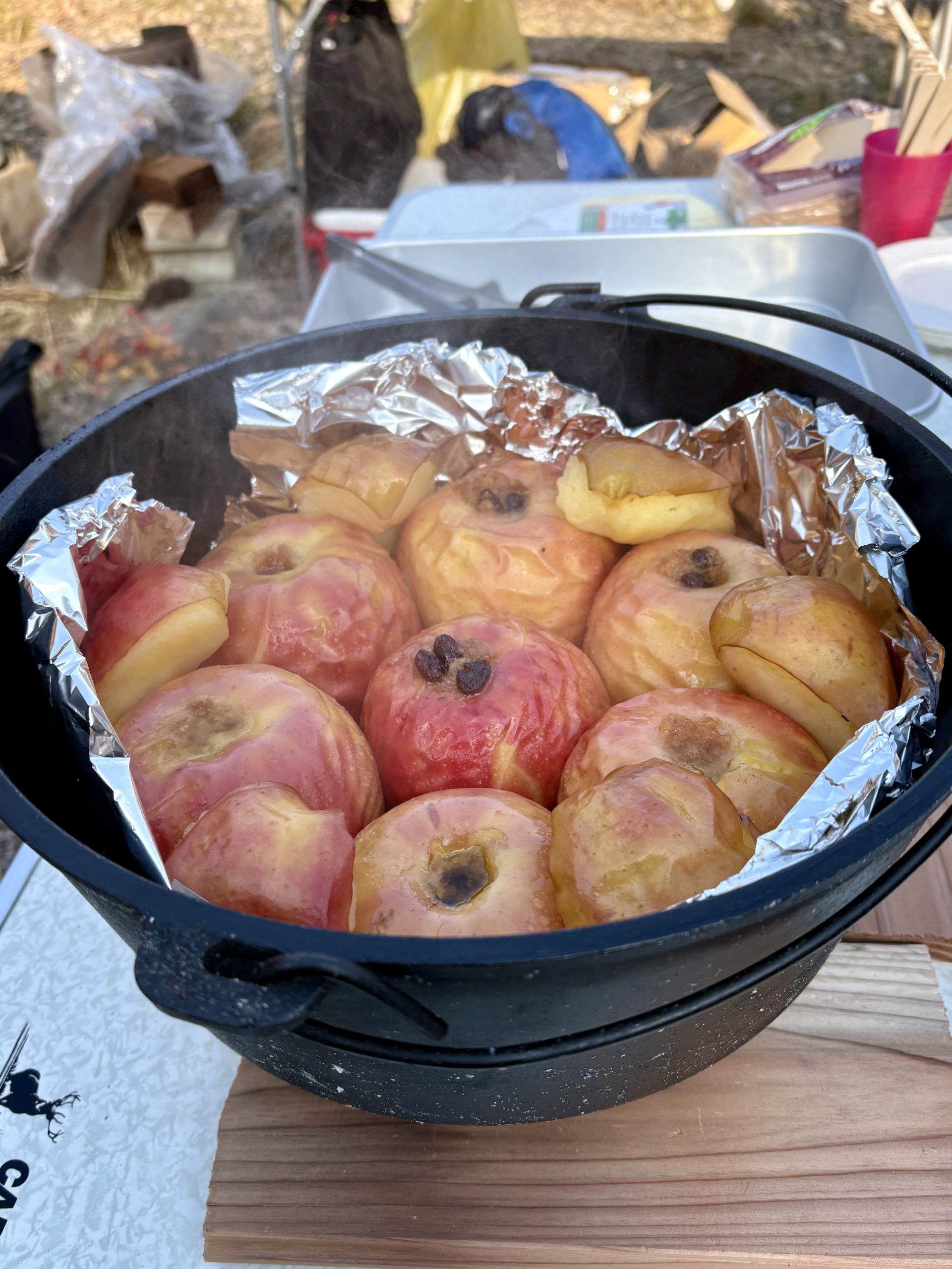 おやつはダッチオーブンで焼いた焼きりんご。